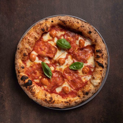 base pomodoro, fior di latte, spianata calabra, gocce di crema nduja, basilico, olio E.V.O.